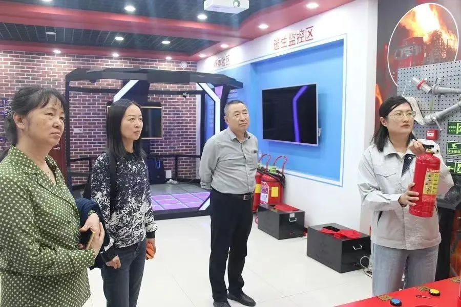 黄虎林(中)陪同德国科格努斯国际教育集团中国区负责人(左二)一行参观石化高技校HSE体验馆。(图/郭翔)