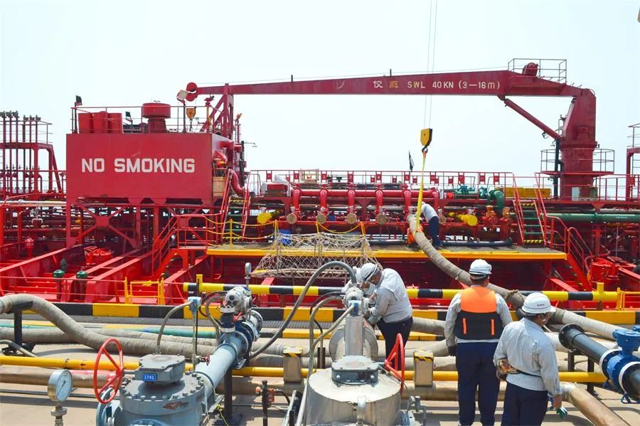 在作业过程中,港方与船方紧密配合,从船舶靠泊到管线对接、氮气试压、启泵装卸,整个流程高效完成,较原计划时间缩短20%。“这是我们首次接卸粗甘油,从手续办理到现场操作,各方协同效率远超预期,同时也是公司第九个货种投用。”海湾港务生产运营部部长助理潘洋洋表示。