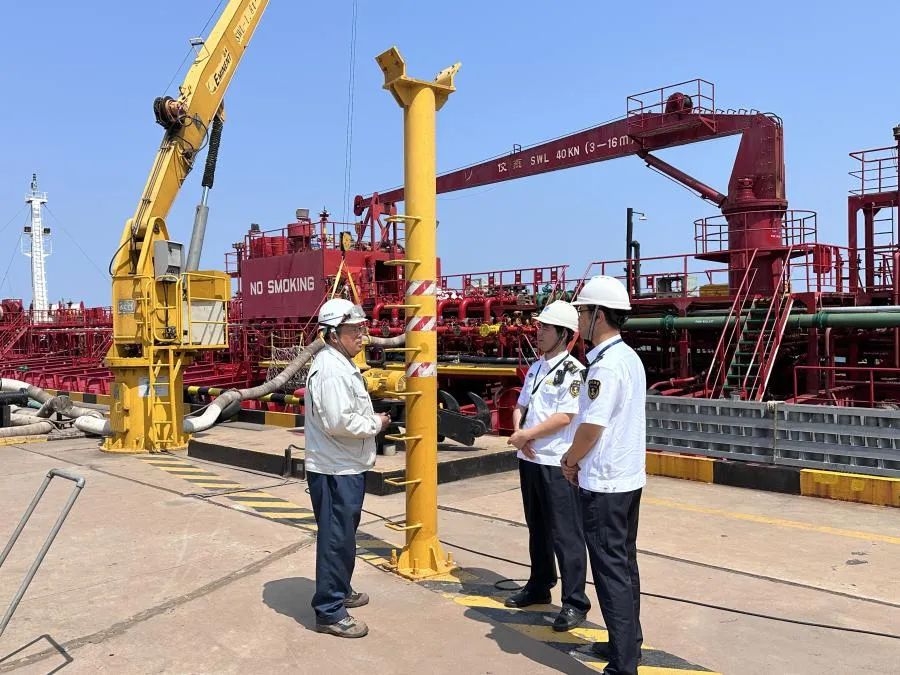 为确保首艘粗甘油船靠泊卸货作业的安全,在靠泊阶段,董家口边检站、董家口港海关、董家口海事局、青岛引航站、董家口调度综合指挥中心等单位全程高度协同,提供从船舶靠泊计划精准制定到作业全过程安全监管的强力保障。同时,海湾港务内部设备保障工作被置于突出位置,工程部积极协调机泵厂家、安装单位,高效完成中转泵增压系统配套变频柜的投用检测、精细调试及启动信号测试,并安排技术人员全程现场值守,以便第一时间响应处置设备突发故障;生产运营部挑选操作骨干,对卸货核心设备(如软管、管线阀门等)进行全面细致的专项检查,并对既定卸货工艺流程进行全流程核查,确保每个操作环节均符合安全规范,多方协作共同构筑坚实的安全屏障,全力确保接卸过程安全顺畅。