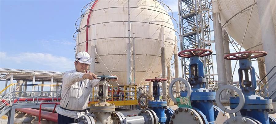 晨曦微露,海湾港务LPG球罐在朝阳下成为“发光体”,散发着金属光泽,纵横交错的管道如同精密的血脉。身着防静电工装的罐区员工张兴正在检查置换工艺,目光专注,不放过每一个接口、每一处阀门。