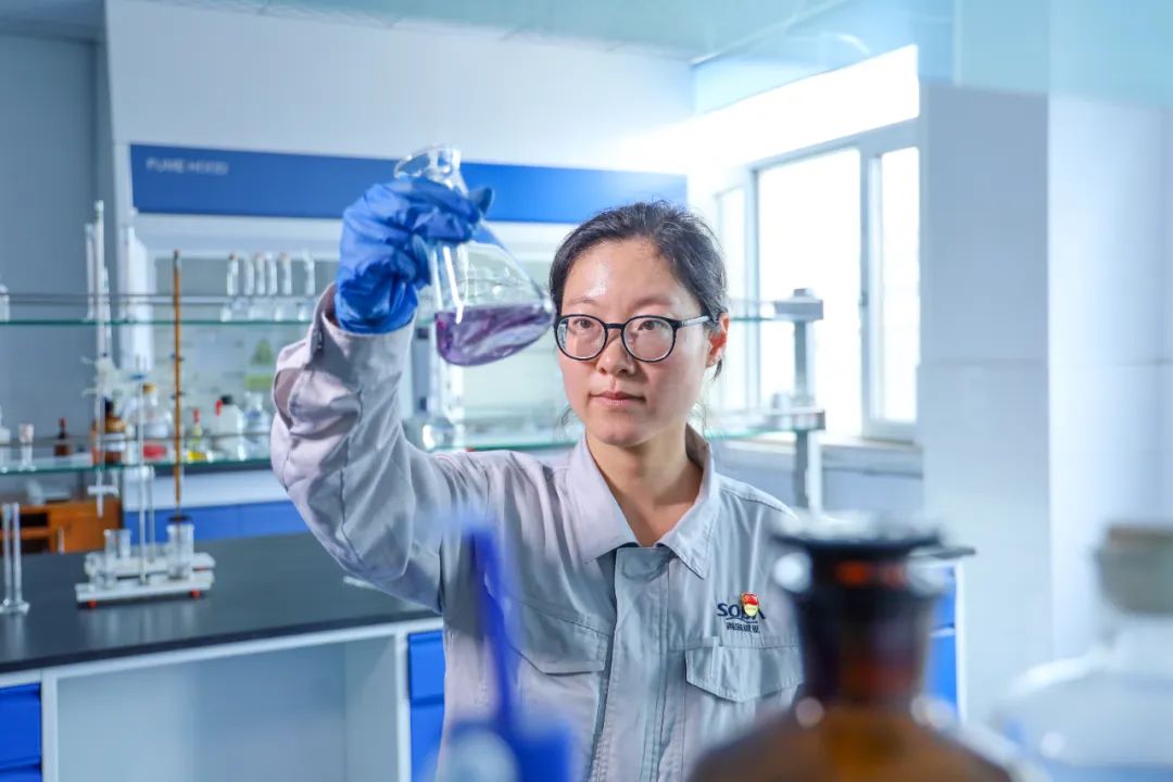 在不断学习的同时,陈双也像老师傅一样,手把手地教团队里的新人。目前,陈双的质检团队共有34人,这支覆盖小苏打、氯化钙、硫酸钾、碳酸二甲酯四大产品线的队伍,实行“四班两运转”制,每班4人,24小时守护产品质量。