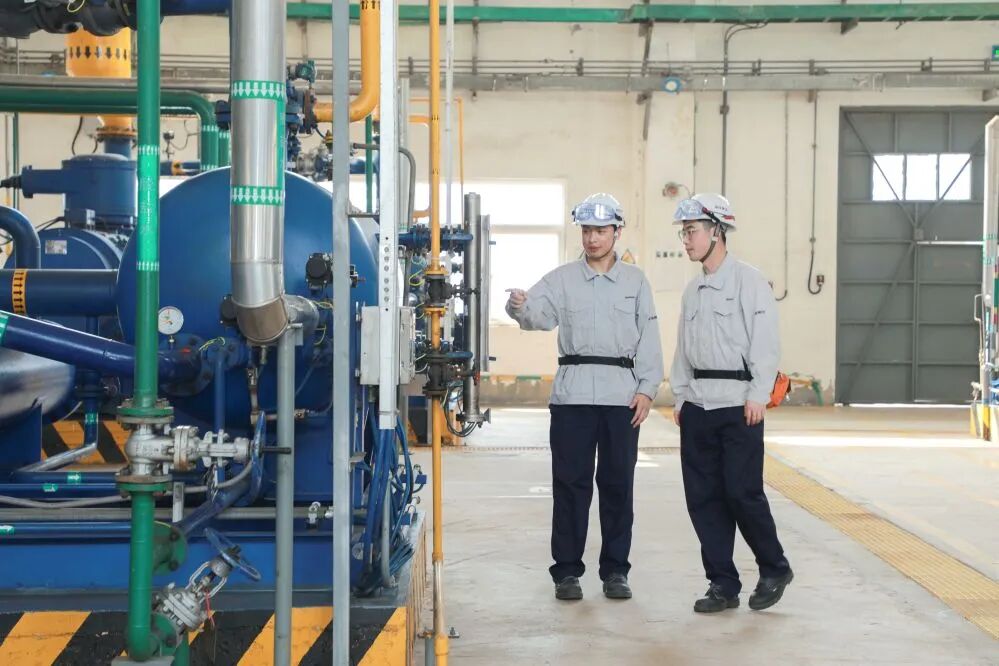 工段长徐全峰和副工段长宋树清是氯氢处理工段的“主心骨”,整个假期都守在一线,带着“严、细、实”的劲头抓生产监管和安全落实。氢气处理厂房里,班前会主操李豪提醒大家:“节日期间必须执行好‘双岗确认、四小时巡检’制度!”他拿起测温枪来到现场,检测完轴承温度后,又开始检查电流压力;在氯压机区域,三台大型氯气压缩机正高效运转,主操林加旭守在DCS系统前紧盯冷却温度。刁泽宇则携带便携式气体检测仪逐段检查法兰接口,对每一处接口进行仔细确认。氢气锅炉作为蒸汽供应关键,更是大家关注的重点。岗位员工进行24小时动态监控,紧盯汽包液位、主蒸汽压力与燃烧工况,精准调控负荷,确保蒸汽系统“不掉队”。