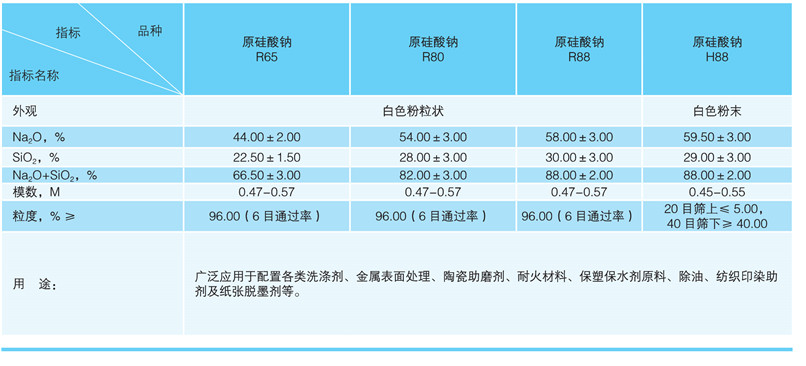 性          质:易溶于水,不溶于醇和酸,水溶液呈碱性,碱性比偏硅酸钠强,置于空气中易吸湿潮解,具有去垢、乳化、分散、湿润、渗透性及对 PH 值有缓冲能力。
