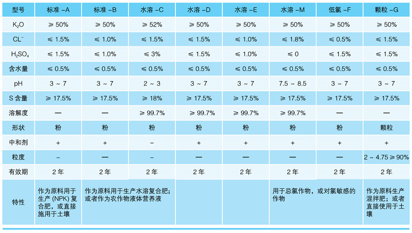 产品规格:包括全水溶和普通 8 个品种,氧化钾含量从 50% ~ 52.5% 粉状或粒状产品