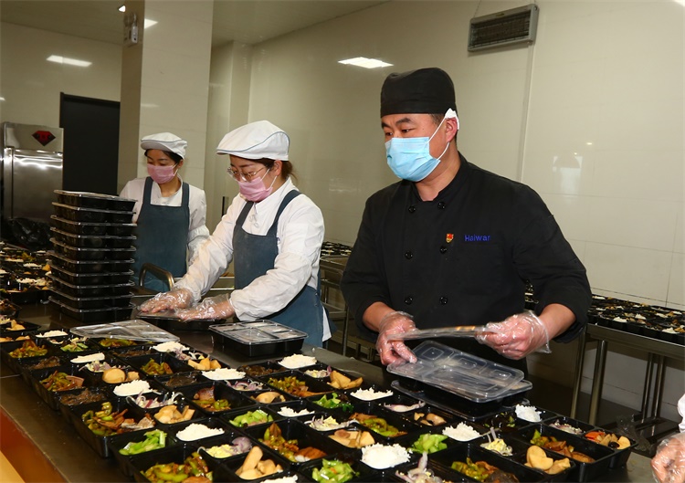 装盒饭,看似简单,其实是个细致活儿。每当这时候,姜平磊都肩负起组长监督的责任,看看分餐的员工是不是都佩戴好了口罩、手套、帽子等防护用品,饭盒是否都整洁摆放,数量上有没有差错……
