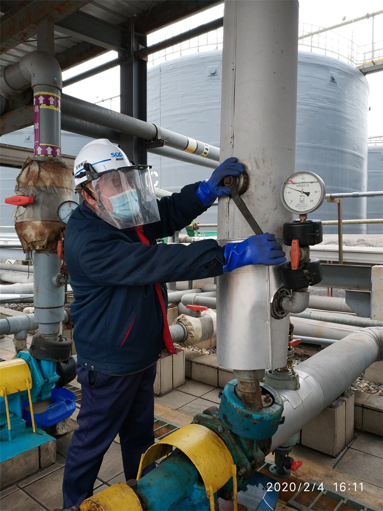 2月4日下午4时,平度新河刮起了五级大风,气温骤然降至零下7度,天空开始飘落雪花。在寒风中,碱业钾肥及无机盐事业部HSE部的卸酸工孙开伟仍然坚守岗位,在盐酸罐区进行盐酸卸车作业。